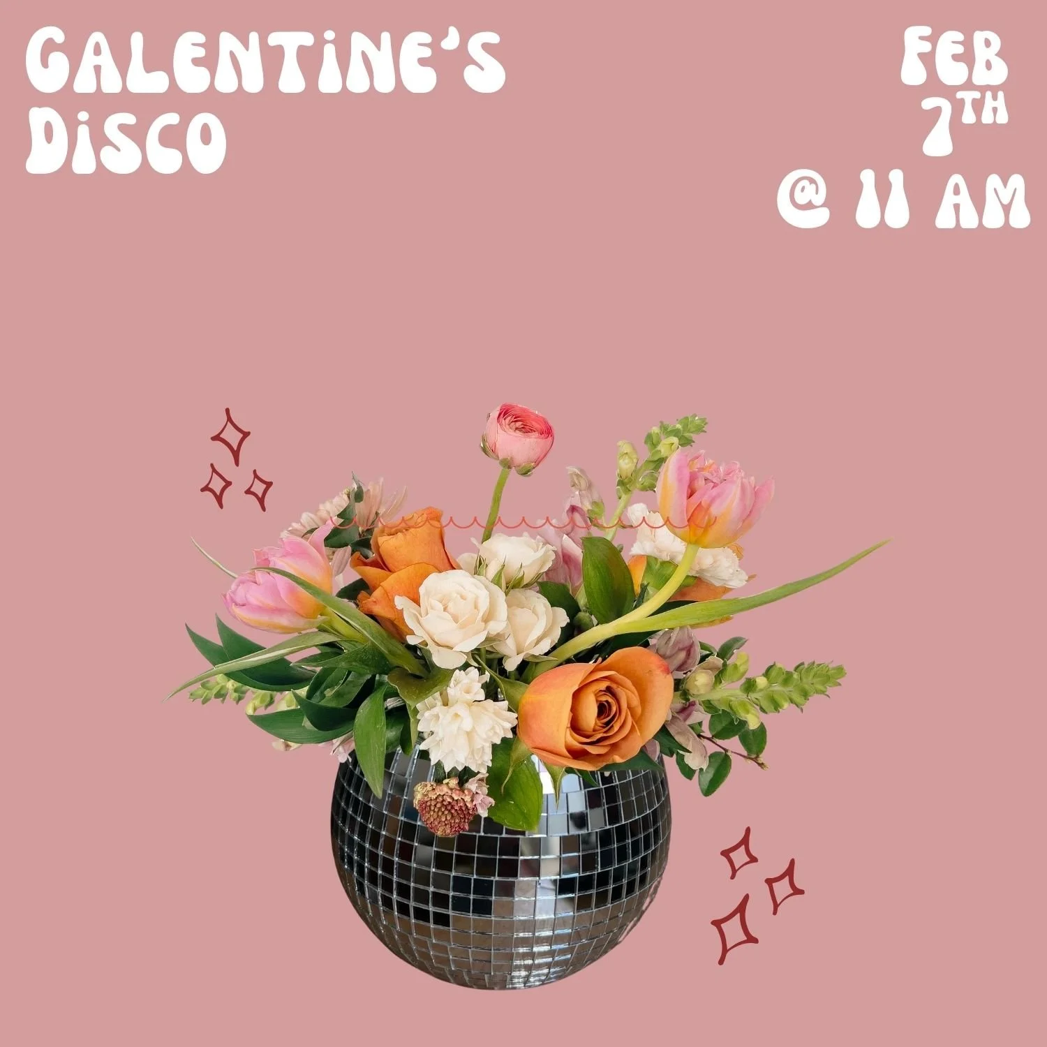 Gather your friends and lets disco. Come make a fun disco ball floral arrangement for Galentine’s day. Includes disco ball vase, florals and arrangement instruciton, refreshments, snacks, and snips while arranging.