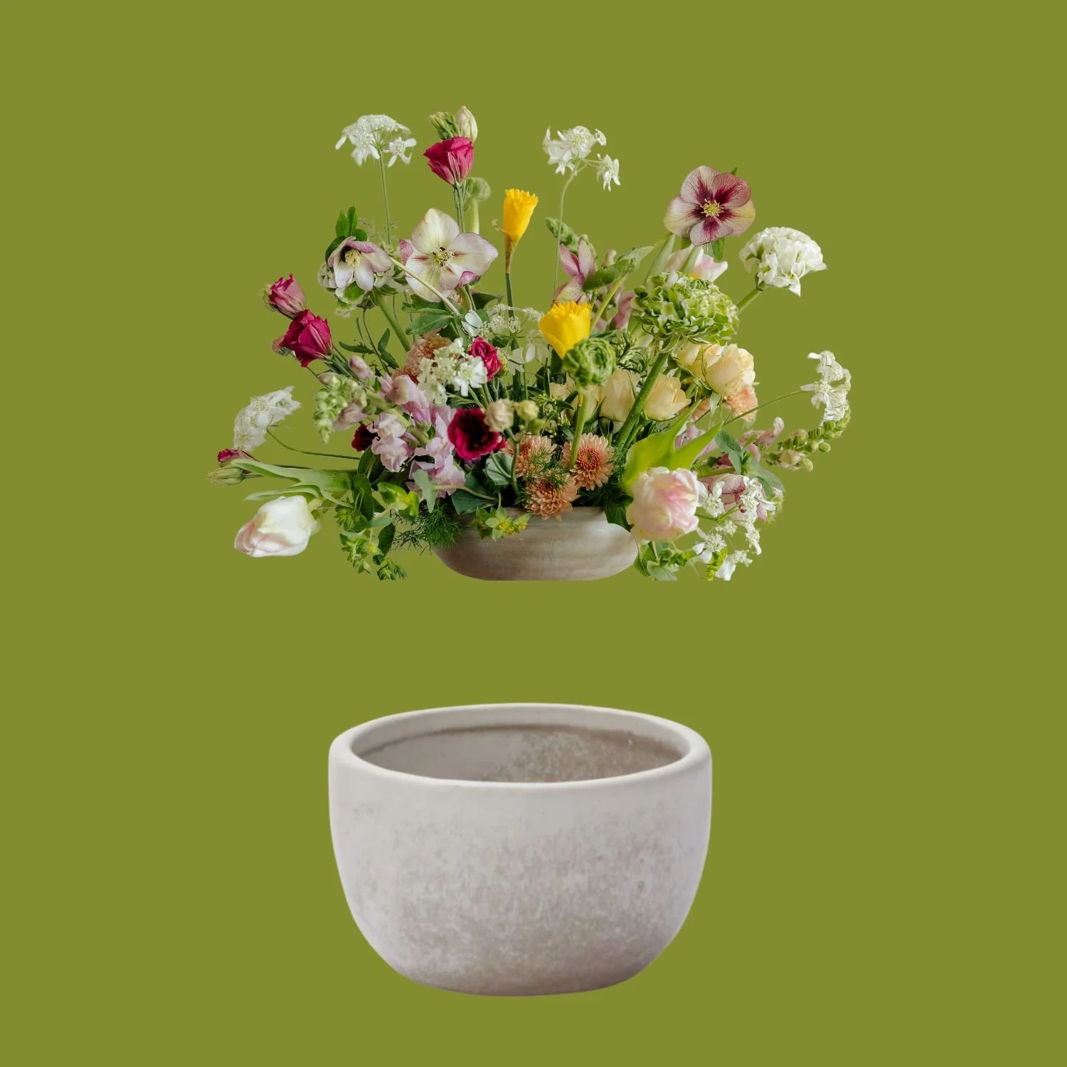 create springy and organic centerpiece for your Easter Table. Created in a concrete dish with seasonal florals. Inspired by a colorful spring garden.